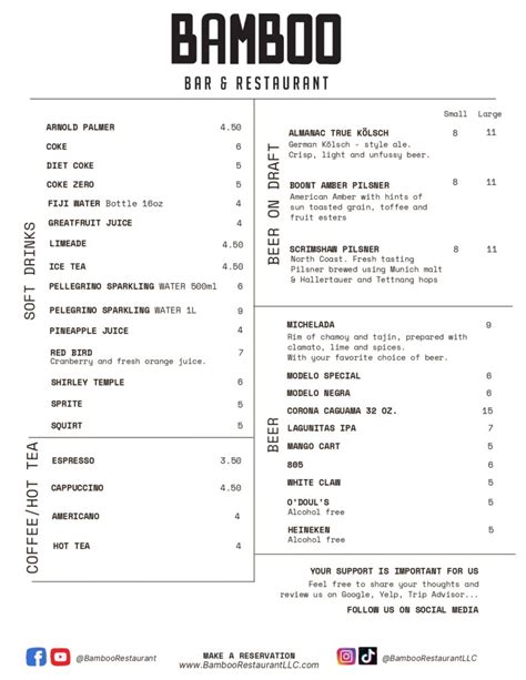 What’s a great meal without the perfect drinks to complement it? The Bamboo Restaurant Menu offers a fantastic selection of beverages to enhance your dining experience. From refreshing soft drinks to exotic cocktails and everything in between, you’ll find the perfect drink to pair with your meal. Whether you’re a fan of classic beverages or looking to try something new, the drink menu has something for everyone. Drinks are important to enjoy the entire menu.