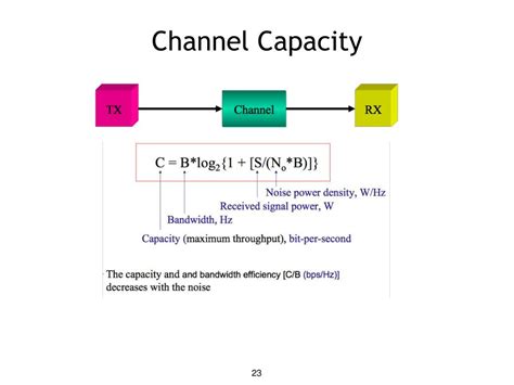 The Shannon-Hartley theorem is the mathematical expression of the channel capacity theorem. It gives us a precise formula to calculate the maximum rate at which information can be transmitted over a channel with a given bandwidth and signal-to-noise ratio. The formula, as mentioned earlier, is C = B log2(1 + S/N) . Let’s break down this formula piece by piece. C represents the channel capacity , measured in bits per second (bps). This is the maximum rate at which you can reliably send information over the channel. B represents the bandwidth of the channel, measured in Hertz (Hz). Bandwidth is essentially the width of the frequency band available for transmission. A wider bandwidth allows for higher data rates. S/N represents the signal-to-noise ratio , which is the ratio of the power of the signal to the power of the noise. It’s a dimensionless quantity, often expressed in decibels (dB). A higher signal-to-noise ratio means that the signal is stronger relative to the noise, making it easier to decode the information accurately. The log2 function is the base-2 logarithm, which tells us how many bits of information can be encoded in each signal. The Shannon-Hartley theorem tells us that the channel capacity is directly proportional to the bandwidth and the logarithm of the signal-to-noise ratio. This means that if you double the bandwidth, you double the channel capacity. However, increasing the signal-to-noise ratio has a diminishing return effect due to the logarithmic relationship. This theorem is a cornerstone of communication system design, providing a fundamental limit on the achievable data rates. It guides engineers in optimizing their systems to maximize the channel capacity while minimizing the error probability. It’s like having a blueprint that shows you the theoretical limits of what’s possible, allowing you to design systems that come as close as possible to achieving those limits.