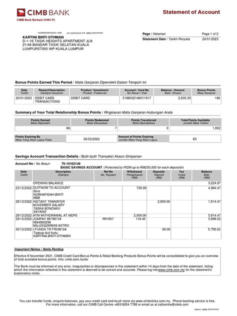 Okay, guys, let’s break down what you’ll actually see on your CIMB account statement . It might look like a lot of numbers and text at first glance, but once you know what to look for, it’s pretty straightforward. The first thing you’ll notice is the header information . This usually includes your name, your address, the account number (often partially masked for security), the statement period (e.g., ‘1st January 2024 - 31st January 2024’), and the date the statement was generated. Make sure your personal details are correct! Next up, you’ll see the opening balance and the closing balance . The opening balance is the amount of money in your account at the very start of the statement period, and the closing balance is the amount at the end. These are your anchor points for the month. The transaction details section is the heart of the statement. Here, you’ll find a chronological list of all your account activity. Each transaction typically includes: