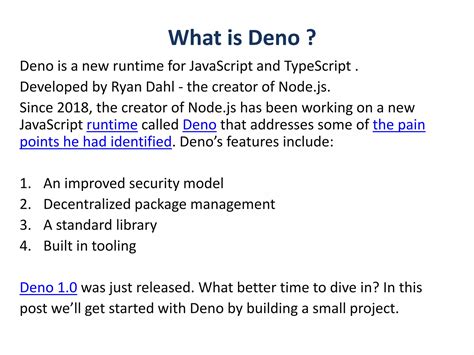 Hey guys! Let’s dive into the exciting world of Deno, a modern, secure runtime for JavaScript and TypeScript. If you’re a web developer or just someone interested in the latest tech, Deno is definitely something you should have on your radar. In this article, we’ll explore what makes Deno so special, how it differs from Node.js, and why you might want to start using it for your next project.