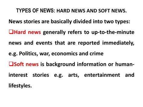 It’s super important to distinguish hard news from soft news . Hard news , as we’ve discussed, focuses on immediacy, objectivity, and factual accuracy . It deals with serious and timely events that have a direct impact on society. Soft news , on the other hand, is more about human interest, entertainment, and emotional appeal . It often explores lighter topics and doesn’t necessarily have the same level of urgency or societal significance.