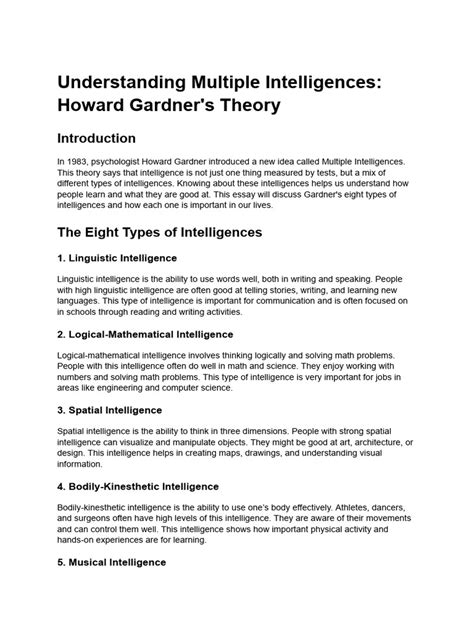 Hey everyone! Today, we’re diving deep into a topic that has seriously changed how we think about intelligence: Howard Gardner’s theory of multiple intelligences . First proposed in 1983 by this awesome psychologist, Gardner challenged the traditional view that intelligence is a single, fixed entity that can be measured by a standard IQ test. Instead, he suggested that we all possess different kinds of intelligence, and that these intelligences are relatively independent of each other. It’s a game-changer, guys, because it means that everyone, absolutely everyone, has their own unique set of strengths and talents. This theory isn’t just academic mumbo-jumbo; it has massive implications for education, personal development, and even how we understand ourselves and others. Think about it – if you struggled in traditional math or verbal subjects, it doesn’t mean you’re not smart. It just means your specific intelligences might lie in areas like music, spatial reasoning, or interpersonal skills. Gardner’s work encourages us to look beyond the textbook and recognize the diverse ways people can be intelligent and successful. He identified eight distinct intelligences , and later considered a ninth, which we’ll get into in a bit. Each of these intelligences represents a different way of processing information and interacting with the world. For instance, someone with strong linguistic intelligence might excel at writing, speaking, and understanding language, while someone with high musical intelligence would likely have a keen ear for rhythm, melody, and pitch. It’s like a spectrum, and we all fall somewhere different on each part of it. This perspective is super important because it validates the experiences of many individuals who might not fit the mold of traditional academic success. It opens up a world of possibilities for learning and growth, allowing us to appreciate the multifaceted nature of human intellect. We’re going to break down each of these intelligences, explore how they manifest, and discuss why Gardner’s ideas are still so relevant today. So, buckle up, and let’s get ready to explore the fascinating landscape of human intelligence!