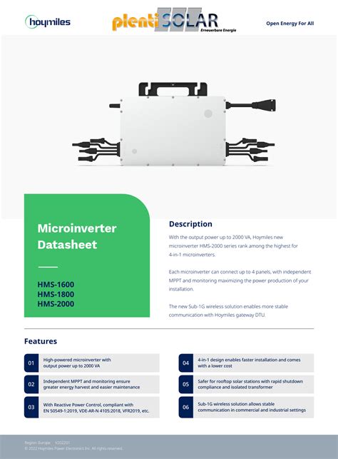 The Hoymiles HMS-2000-4T isn’t just another microinverter; it’s a serious contender for anyone looking to get the most out of their solar panels, especially if you’ve got limited space or a complex roof layout. What sets this unit apart, guys, is its ability to connect up to four individual solar modules . This means you can pack more power onto your roof without needing a whole army of separate inverters. Think about it – more panels, more sunlight captured, and ultimately, more electricity generated for your home. It’s all about efficiency and smart design, and the HMS-2000-4T really delivers on that front. We’re talking about a device that’s built to last, engineered with cutting-edge technology to ensure your solar system is not only powerful but also reliable. The sheer flexibility it offers is a huge plus. Whether you have a few panels or are looking to expand your system, this 4-in-1 marvel simplifies installation and management. It’s a game-changer for homeowners and installers alike, streamlining the process and potentially cutting down on labor costs. Plus, the enhanced safety features that come standard with most Hoymiles products mean you can sleep soundly knowing your system is protected.