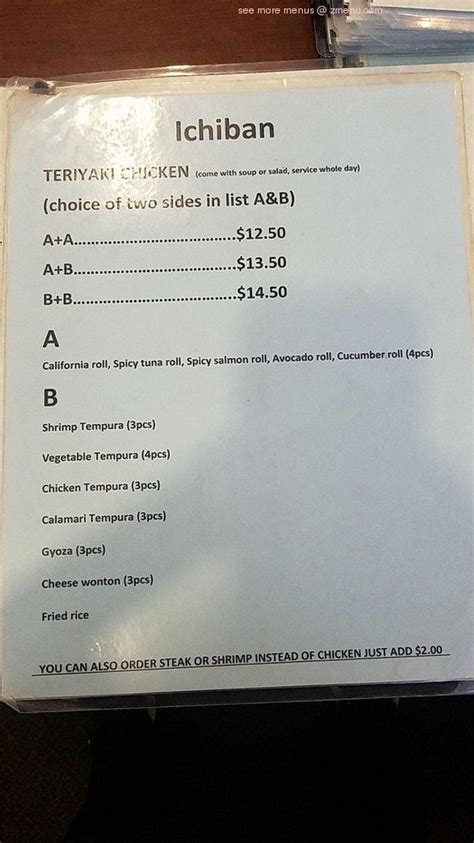 Alright, let’s get down to business, shall we? The Iichiban Tehachapi menu is your gateway to a world of culinary delights. From classic sushi rolls to savory noodle dishes and hearty entrees, there’s something to satisfy every craving. One thing that immediately jumps out is the variety. Whether you’re a seasoned sushi aficionado or a newbie eager to explore Japanese cuisine, this menu has got you covered. They have it all, from the freshest sushi and sashimi to those warm, comforting dishes that make you feel all cozy inside. Their menu’s layout is pretty straightforward, which makes ordering a breeze. You’ll find sections dedicated to appetizers, soups and salads, sushi, entrees, and even some tempting desserts. Iichiban Tehachapi menu is more than just a list of dishes, it’s an invitation to a delicious experience. This article will break down all the menu’s key highlights, ensuring you know what to expect when you walk in the door. Iichiban Tehachapi menu is a goldmine. The extensive selection caters to various tastes, dietary requirements, and preferences. The menu has something for everyone, whether you’re a die-hard sushi fan or prefer more traditional Japanese dishes. They have options for the whole family! From the fresh, expertly prepared sushi to the warm, comforting dishes, every item is crafted with care and attention to detail.