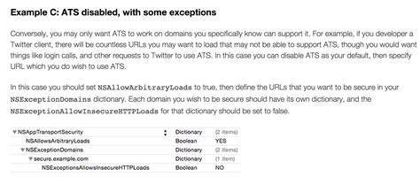 In this example, we’re creating an exception for example.com , allowing insecure HTTP connections and disabling the forward secrecy requirement. Again, use this with caution! Make sure to thoroughly document why you’re disabling ATS for specific domains, as Apple may ask for justification during the app review process. Configuring ATS correctly can be a bit tricky, but it’s well worth the effort to ensure your app’s security and compliance. Play around with the settings, test your app thoroughly, and don’t be afraid to consult Apple’s documentation for more details. You got this!