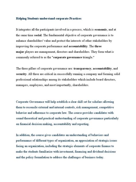 Let’s kick things off with accountability . Guys, this is arguably the most critical pillar of good corporate governance. What does it really mean? Simply put, it means that the board of directors and management are answerable for their actions and decisions to the company’s shareholders and other stakeholders. This isn’t just about pointing fingers when something goes wrong; it’s about establishing clear lines of responsibility and ensuring that those in charge can be held to account for their performance and conduct. Think about it: if no one is responsible, how can you trust anyone to do the right thing? Accountability fosters transparency because it necessitates clear reporting and disclosure. When companies are accountable, they’re more likely to be open about their operations, their financial performance, and any challenges they face. This transparency builds trust with investors, customers, and the public. It’s about having robust internal controls and audit functions to ensure that operations are conducted ethically and in compliance with laws and regulations. This means having independent directors on the board, audit committees, and clear policies on conflicts of interest. When a company demonstrates strong accountability, it signals to the market that it’s a well-managed entity, less prone to fraud or mismanagement. This, in turn, can lead to a lower cost of capital and a higher valuation. It’s the foundation for ethical behavior , because knowing you’ll be held responsible for your decisions encourages a more thoughtful and responsible approach. Without accountability, the other pillars can easily crumble, leading to potential scandals, financial losses, and a damaged reputation that can take years, if not decades, to repair. So, when you’re looking at a company, ask yourself: how accountable are they? Do they have clear reporting structures? Are their leaders open about their performance? The answers to these questions can tell you a lot about the company’s true health and integrity. It’s the mechanism that ensures power isn’t abused and that the company operates for the benefit of all its stakeholders, not just a select few.