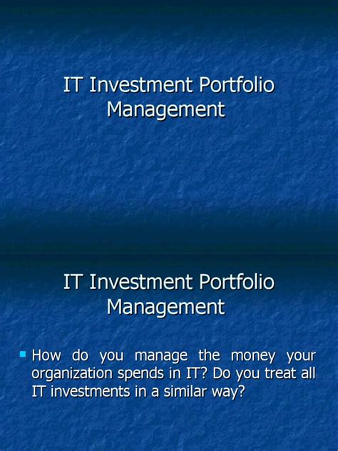 Hey guys, let’s talk about something super important for any business, big or small: your IT investment portfolio . You know, that collection of all the tech stuff your company uses, from the servers humming in the background to the fancy software your team relies on. Building and managing a killer IT investment portfolio isn’t just about buying the latest gadgets; it’s a strategic move that can seriously boost your company’s performance, efficiency, and ultimately, its bottom line. Think of it like curating a world-class art collection – you want pieces that are valuable, serve a purpose, and contribute to the overall masterpiece. In the tech world, this means making smart decisions about where you put your money and resources, ensuring every investment is working for you, not against you. We’re going to dive deep into why this matters, how to get it right, and some common pitfalls to avoid. So, buckle up, because understanding your IT investment portfolio is fundamental to staying competitive in today’s fast-paced digital landscape. It’s about more than just keeping the lights on; it’s about fueling innovation, driving growth, and ensuring your business is future-proofed. Ready to supercharge your tech strategy? Let’s get started!