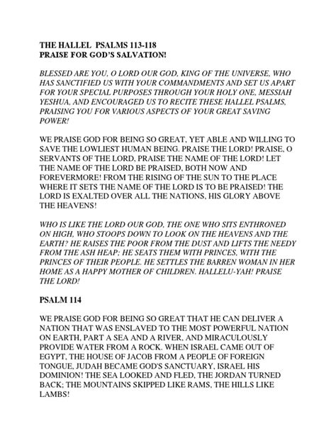 The Hallel Psalms (Psalms 113-118) are a collection of six psalms recited in Judaism on festive occasions. The word “Hallel” itself means “praise” in Hebrew, so you already know what you’re getting into – a whole lotta praising! These psalms are like the ultimate playlist for celebrating God’s goodness and faithfulness. Historically, they were sung during major Jewish holidays such as Passover, Shavuot (Weeks), Sukkot (Tabernacles), and Hanukkah. Think of them as the soundtrack to some of the most important moments in the Jewish calendar. These psalms aren’t just read; they’re experienced . They’re chanted with fervor, often accompanied by musical instruments, creating an atmosphere of communal joy and thanksgiving. Imagine being part of a crowd, voices blending together in harmonious praise – that’s the spirit of the Hallel Psalms! They serve as a powerful reminder of God’s enduring love, His miraculous interventions in history, and the hope He offers for the future. Whether you’re Jewish or not, the themes of deliverance, gratitude, and unwavering faith found in these psalms resonate deeply with the human spirit. So next time you’re feeling grateful or need a boost of encouragement, turn to Psalms 113-118 and let the Hallel Psalms lift your heart. You might just find yourself joining in the chorus of praise!
