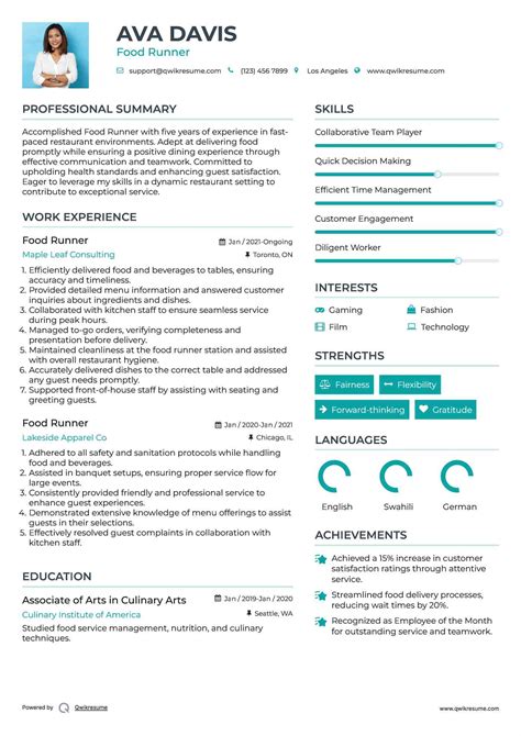 List your previous jobs in reverse chronological order (most recent first). For each job, include the company name, your job title, dates of employment, and a brief description of your responsibilities and accomplishments. Even if you haven’t worked in a restaurant before, think about other jobs where you’ve demonstrated relevant skills like teamwork, customer service, or attention to detail. Did you volunteer at a local charity? Were you part of a school club? Highlight those experiences! When describing your responsibilities, use action verbs to showcase your accomplishments and quantify your results whenever possible. For example, instead of saying “Assisted with food preparation,” try “Assisted with food preparation, increasing efficiency by 15%.” This demonstrates your value to potential employers and sets you apart from other candidates. Remember to tailor your work experience section to the specific requirements of the food runner position. Focus on highlighting skills and experiences that are relevant to the job, such as teamwork, customer service, and attention to detail. By showcasing your relevant skills and accomplishments, you can demonstrate your ability to excel in the role and contribute to the success of the restaurant.
