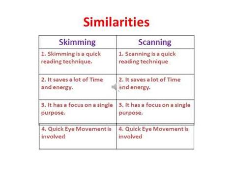 Alright, let’s nail down the key differences between skimming and scanning once and for all. The main difference lies in your purpose. Skimming is for getting a general overview, while scanning is for finding specific information. Think of skimming as reading the movie trailer to see if you’re interested, and scanning as searching for showtimes at your local cinema. Skimming involves reading selectively, focusing on key elements like headings, introductions, and conclusions. Scanning, however, involves quickly moving your eyes across the text, looking for specific keywords or phrases.