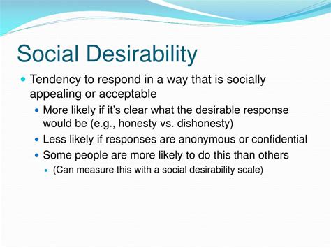 To better grasp social desirability, let’s consider some specific examples. In the realm of health, individuals may exaggerate their adherence to medical advice, such as taking prescribed medications or following dietary guidelines. In the context of environmental attitudes, people might overstate their commitment to sustainable practices, like recycling or conserving energy. Similarly, in studies on political opinions, respondents may express more moderate views to avoid appearing extreme or controversial. These examples underscore the pervasive nature of social desirability and highlight the challenges researchers face in obtaining honest and unbiased data. Recognizing these tendencies is crucial for interpreting research findings and developing strategies to minimize bias.