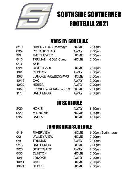 As we embark on this thrilling journey through the Southside football schedule , it’s essential to understand the significance of this schedule for both players and fans. For the players, the schedule represents a roadmap, a challenge, and an opportunity. Each game is a test of skill, teamwork, and determination. They train tirelessly, week after week, preparing to face off against their rivals. The schedule dictates their routines, their focus, and their commitment. For the fans, the schedule is a source of anticipation, excitement, and community. It’s the framework around which we build our weekends, our social gatherings, and our shared experiences. It’s the promise of cheering on our team, celebrating victories, and commiserating over defeats. The schedule is more than just a list of dates and times; it’s a symbol of tradition, pride, and passion. The Southside football schedule is a vital component of the team’s season, providing structure and focus for the players while also serving as a focal point for the fans. The anticipation surrounding each game, the rivalries, and the communal experience of attending games are all enhanced by the meticulously planned schedule. So, let’s dive into the details and make sure you’re fully prepared to enjoy every moment of the Southside football season!