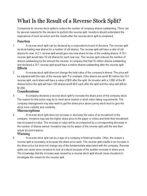 To wrap things up, understanding a 5-for-1 reverse stock split is all about looking beyond the immediate mechanics and diving into the ‘why’ and ‘what next’. We’ve seen that while it might seem like a simple reduction in share count, it’s often a strategic move by companies to improve their stock’s market perception, meet exchange requirements, or attract institutional investors. For shareholders, the key takeaway is that your total investment value should theoretically remain the same right after the split, but the price per share increases, and the number of shares decreases. Remember to keep an eye on how fractional shares are handled and to adjust your cost basis for tax purposes. While a reverse split can offer potential benefits like preventing delisting and improving stock appeal, it also carries risks, primarily the negative market perception and the fact that it doesn’t fix underlying business problems. The ultimate success or failure of a reverse stock split for investors hinges on the company’s ability to execute its business plan and improve its fundamental performance after the split. So, guys, always do your homework. Look at the company’s financials, its management’s strategy, and the overall market sentiment. A reverse stock split is just one piece of the puzzle when evaluating an investment. By staying informed and critical, you can better navigate these corporate actions and make sound investment decisions. Keep learning, and happy investing!