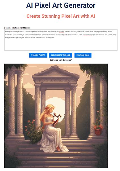 • Pixel AI: (Example) Pixel AI is a very intuitive and user-friendly platform that is perfect for beginners and experienced artists. It allows you to generate pixel art from text prompts, images, or a combination of both. You can also customize the output by adjusting the resolution, color palette, and style. The website also provides a large library of pre-made prompts and styles to help you get started.