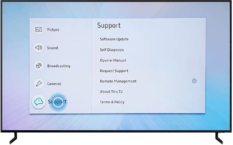 • Scroll down and select Support . This section typically contains diagnostic tools, e-Manuals, and, importantly, software update options.