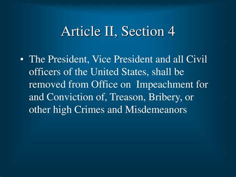 Alright, let's get straight to the point. Article 2, Section 4 of the U.S. Constitution states: "The President, Vice President and all civil Officers of the United States, shall be removed from Office on Impeachment for, and Conviction of, Treason, Bribery, or other high Crimes and Misdemeanors." Now, that might sound a bit formal and old-fashioned, but what it really means is pretty straightforward, guys. It outlines the specific circumstances under which the highest officials in the land can be removed from their positions. We're talking about the President, the Vice President, and any other 'civil officers.' This section is the constitutional backbone for the impeachment process, which is a critical mechanism designed to ensure accountability. It's not a criminal trial in the traditional sense, but rather a political process to remove officials who have violated the public trust. The key here is understanding the grounds for impeachment: Treason, Bribery, or other high Crimes and Misdemeanors . These aren't just random offenses; they represent serious abuses of power or violations of one's oath of office. The Constitution doesn't give a super-detailed, exhaustive list, leaving room for interpretation, which has led to considerable debate throughout history. But the core idea is clear: impeachment is for conduct that is fundamentally incompatible with the duties and responsibilities of public office. The process itself involves two main stages: impeachment by the House of Representatives and a trial in the Senate. So, when we talk about Article 2, Section 4, we're really talking about the foundational rules for holding our leaders accountable when they step out of line. It's a powerful tool, but it's also designed to be used judiciously, not for partisan political gain. This section ensures that even the most powerful figures in the U.S. government are not above the law and can be held responsible for their actions. It's a cornerstone of the American system of checks and balances, safeguarding the republic from potential tyranny or corruption at the highest echelons of power. The wording, while concise, carries immense weight and has shaped numerous historical events and ongoing political discussions. It's a vital piece of the constitutional puzzle, guys, and understanding it is key to understanding how our government is designed to function and how it polices itself.