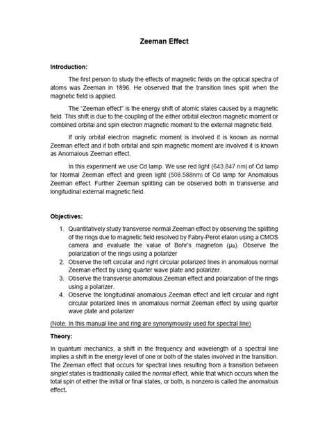 The anomalous Zeeman effect is observed when the spin angular momentum of the electrons cannot be ignored. This is the more common case and occurs in atoms with an odd number of electrons or when the total spin angular momentum is non-zero. The interaction between the electron’s spin and orbital angular momenta leads to a more complex splitting pattern. The energy shift of each sublevel is no longer directly proportional to the magnetic field strength and the magnetic quantum number but also depends on the total angular momentum quantum number. As a result, the spectral lines split into more than three components, and the spacing between the lines is not uniform.